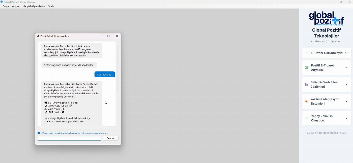 Global Pozitif'in geliştirdiği yapay zeka destekli teknik asistan, Java, AKİS ve GİB programı sorunlarınızı, sisteminize özel çözümlerle saniyeler içinde giderir.
